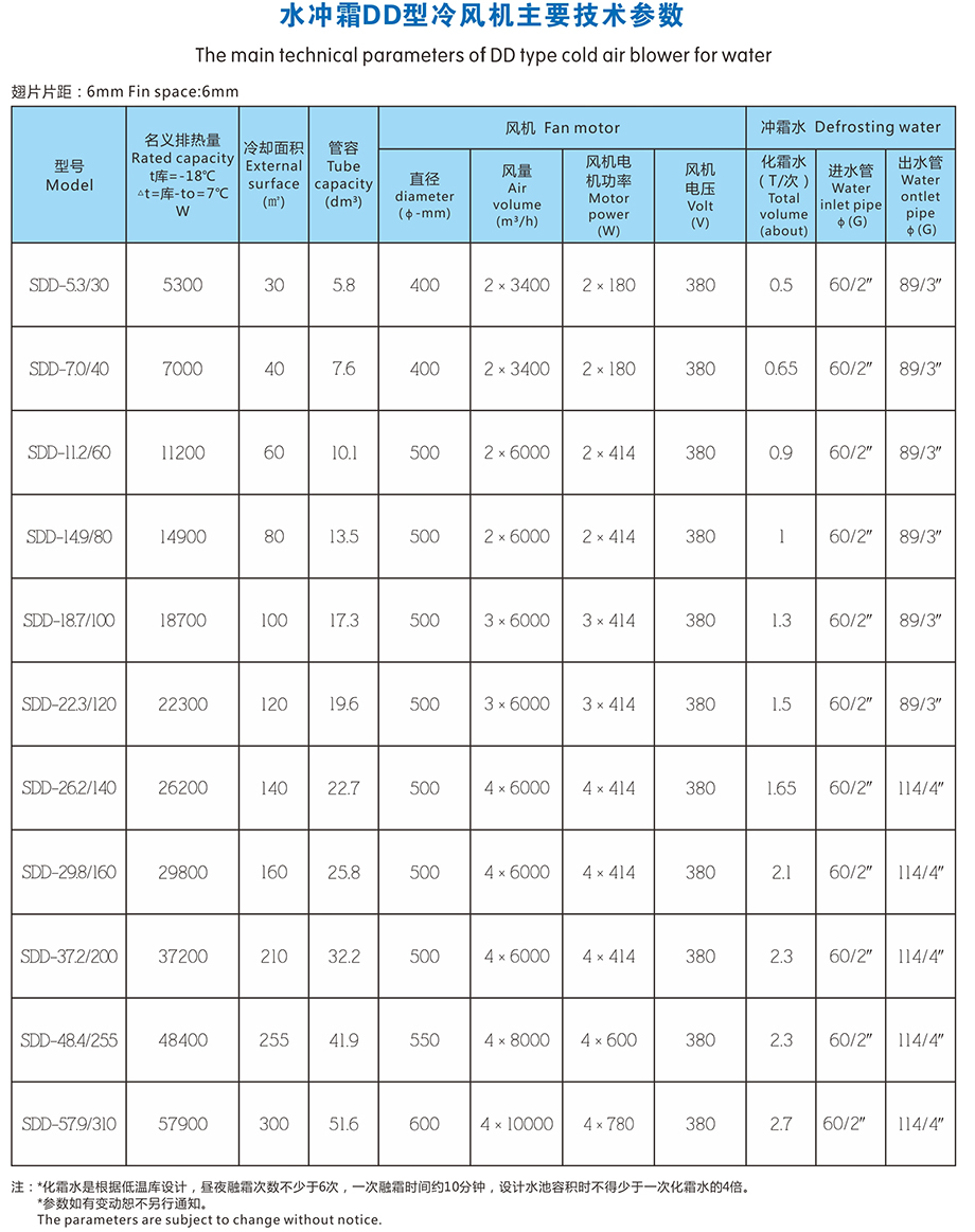 水冲霜冷风机是一种配套于不适用电热除霜或者要求快速除霜的冷库使用的库内降温设备,根据适用温度,